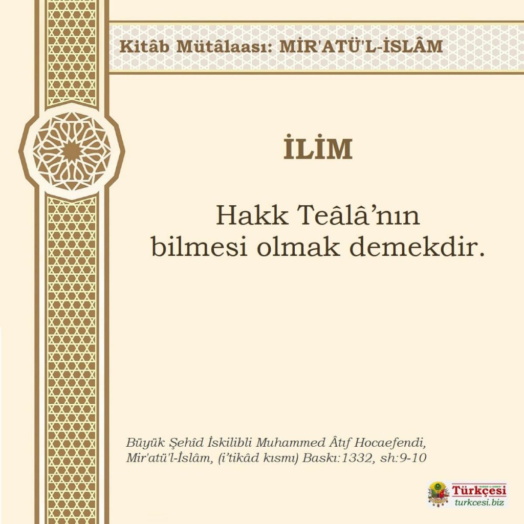 (İLİM) Hakk Teâlâ’nın bilmesi olmak demekdir. Cenâb-ı Hakk (ALÎM)’dir ya'ni cüz’iyyât ve külliyyâtı, yerlerde ve göklerde hâzır ve gâib, gizli ve âşikâr