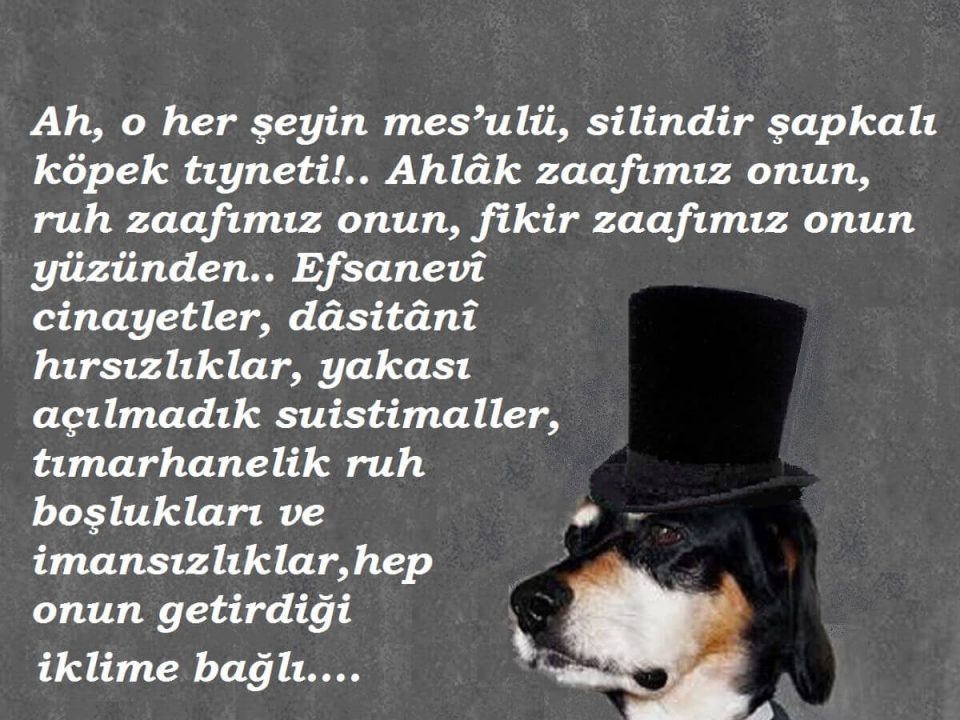 Ah, o her şeyin mes’ulü, silindir şapkalı köpek tıyneti!. Ahlâk zaafımız onun, ruh zaafımız onun, fikir zaafımız onun yüzünden… Efsanevî cinayetler, dâsitânî