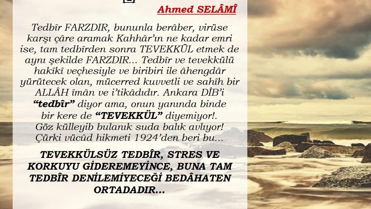 Tedbîr ve tevekkülü hakîkî veçhesiyle ve biribiri ile ahengdâr yürütecek olan, mücerred kuvvetli ve sahih bir ALLÂH îmân ve i’tikâdıdır. Ankara DİB’i “tedbir” diyor ama, onun yanında yüzde bir kere de “TEVEKKÜL” diyemiyor!. Göz külleyib bulanık suda balık avlıyor! Çünki vücûd hikmeti, 1924’den beri bu…