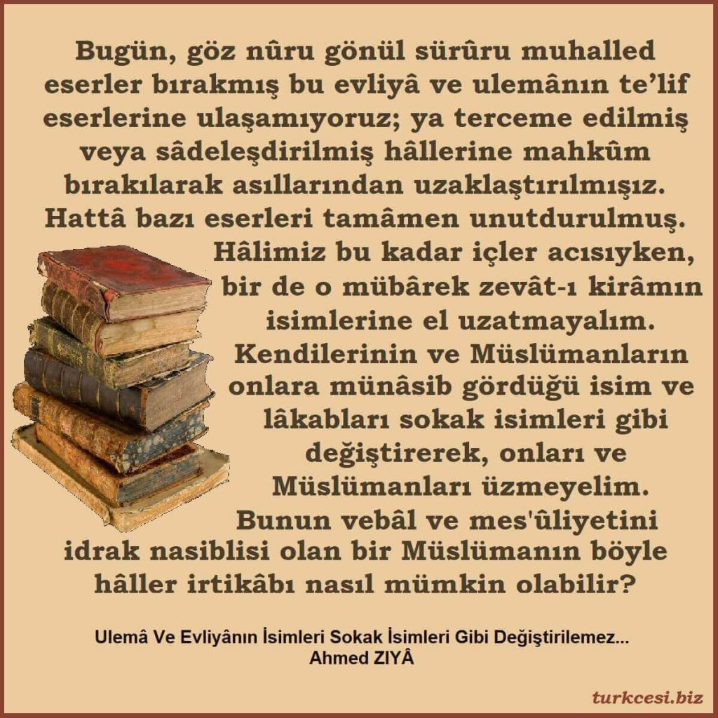 Bugün, göz nuru gönül sürûru muhalled eserler bırakmış bu evliyâ ve ulemânın te’lif eserlerine ulaşamıyoruz; ya terceme edilmiş veya sâdeleşdirilmiş hâllerine mahkûm bırakılarak asıllarından uzaklaştırılmışız. Hattâ bazı eserleri tamamen unutdurulmuş. Hâlimiz bu kadar içler acısıyken, bir de o mübârek zevât-ı kirâmın isimlerine el uzatmayalım. Kendilerinin ve müslümanların onlara münâsib gördüğü isim ve lâkabları sokak isimleri gibi değiştirerek, onları ve Müslümanları üzmeyelim. Bunun vebal ve mes’uliyetini idrak nasiblisi olan bir müslümanın böyle hâller irtikâbı nasıl mümkin olabilir?