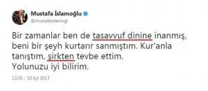“Bir zamanlar ben de tasavvuf dinine inanmış, beni bir şeyh kurtarır sanmıştım. Kur’anla tanıştım, şirkten tevbe ettim. Yolunuzu iyi bilirim.” (10 Eylül 2017, sa: 13.35)