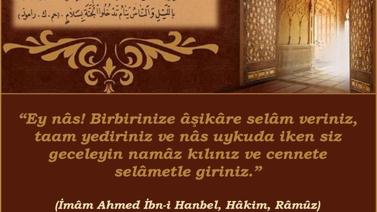 “Ey nâs! Birbirinize âşikâre selâm veriniz, taam yediriniz ve nâs uykuda iken siz geceleyin namâz kılınız ve cennete selâmetle giriniz.”