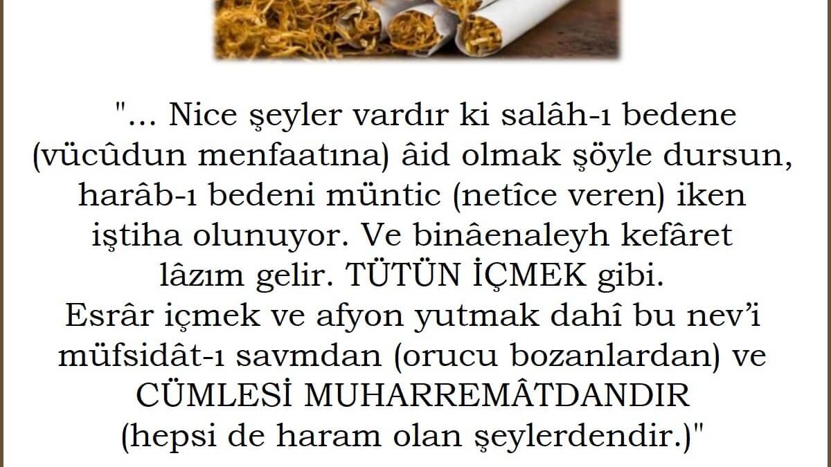 “Bunlar gerek tegaddî yâhud tefekküh (hoşlanma) tarîkıyla (yoluyla) olsun, gerek tedâvî tarîkıyla yenilmiş bulunsun. Tab-ı selîm (güzel yaratılış) ıslâh-ı beden (vücûdun ıslâhı) içün tenâvül-i devâyı dahî dâî olmağla (gıdalı şeyleri alıp yemeyi dahî istediğinden), hâl-i savmda (oruçluyken) zecr (yasak) meşrû’ (şer’î emir) olmuşdur. Tegaddînin (gıdâlanmanın) ma’nâsında ihtilâf etdiler. Kimi dedi ki tagaddî: Tab’ın bir şey’e meyl edüb, şehvet-i bâtın, anınla münkazî olmakdır. Ve kimi dedi ki, tegaddî: Nef-i salâh-ı bedene (vücûdun salâh ve menfaatına) âid olan şey’i tenâvül etmekdir (alıp yemekdir.) Semere-i hılâf, çıkan çiğnentiyi iâdede zâhirdir ki evvelki kavle göre, ona kefâret lâzım olmayıp, ikinci kavle göre lâzım olur. Doğrusu evvelki kavildir. Nice şeyler vardır ki salâh-ı bedene (vücûdun menfaatına) âid olmak şöyle dursun, harâb-ı bedeni müntic (netîce veren) iken iştiha olunuyor. Ve binâenaleyh kefâret lâzım gelir. TÜTÜN İÇMEK gibi. Esrâr içmek ve afyon yutmak dahî bu nev’i müfsidât-ı savmdan (orucu bozanlardan) ve CÜMLESİ MUHARREMÂTDANDIR (hepsi de haram olan şeylerdendir.) –Dürr-i Muhtâr’ın kitâbü’l-eşibesine bakınız.”