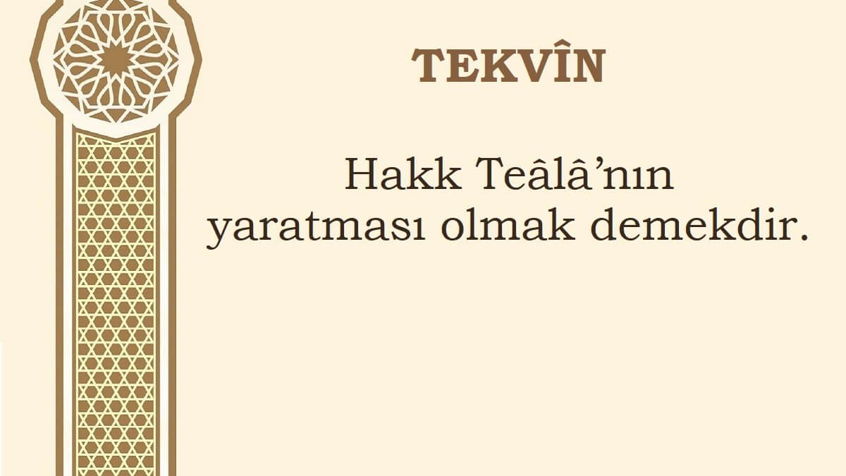 (TEKVÎN) Hakk Teâlâ’nın yaratması olmak demekdir Cenâb-ı Hakk (MÜKEVVİN)dir ya’ni cümle mevcûdâtı yaradıcıdır A’ndan başka yaradıcı yokdur. Yerleri ve anda olan şey’leri, gökleri ve anda bulunan şey’leri yaradan odur insanları ve hayvanları ve bunların amellerini, işlerini, yürümelerini, oturmalarını, yatmalarını, kalkmalarını, hareketlerini, sükûnlarını, insanların günâhlarını, şerlerini, hayr ve ibâdetlerini yaradan ancak O’dur. Rızk, hastalık, sıhhat, ölüm, dirilik hep A’nın yaratmasıyla hâsıl olur.
